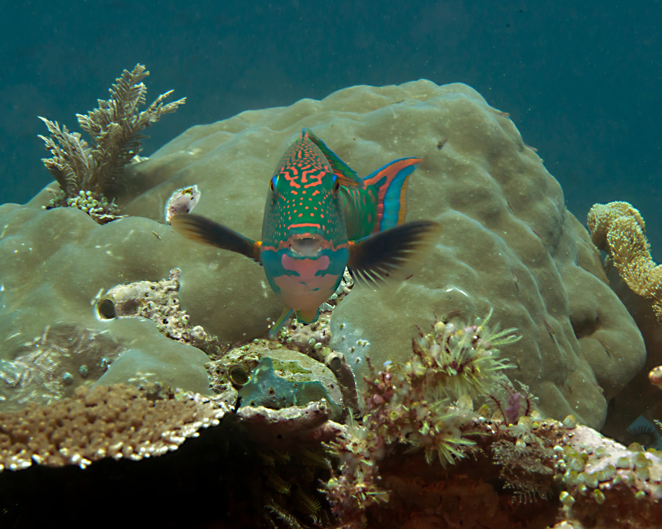 Parrotfish get their name from their strong, fused teeth that resemble a parrot’s beak. This unique tool allows them to scrape algae off hard coral surfaces—a behaviour crucial for coral survival.